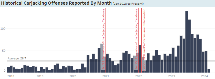 Unlike murders, carjackings are tough to track using city data because most cities do not publish data on these incidents. Usually they get rolled up into other types of robbery.