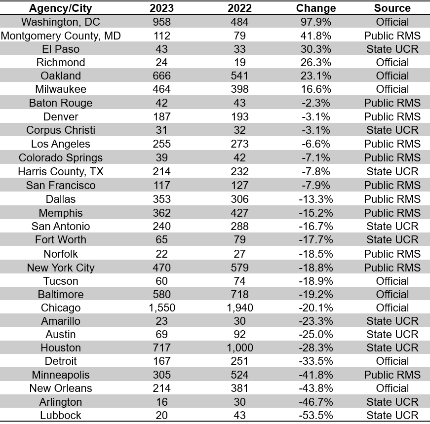 But carjackings are somewhat tough to define, most agencies do not publish formal statistics on carjackings, and I had to use various sources of data to compile the above table of 30 cities. It’s safe to say that carjackings fell from 2022 to 2023 in these cities, though incidents remained more common many places compared to pre-COVID in some of them. The above data weaknesses, however, mean that there remains some uncertainty to the assessment that carjackings fell more broadly in 2023.