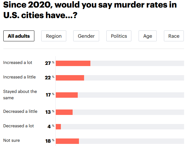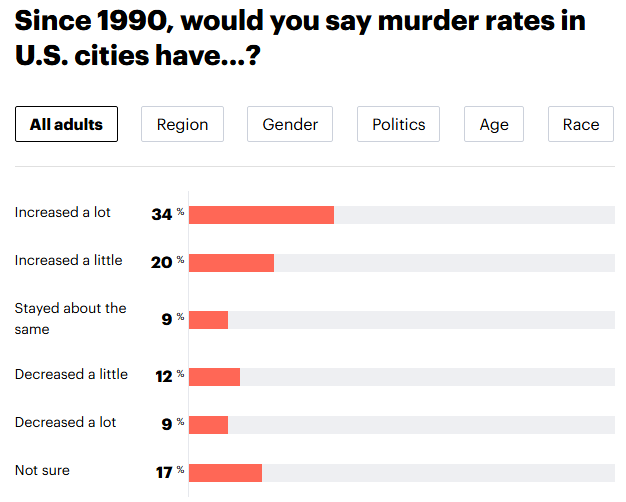So “the media” is definitely talking about the murder decline, yet these pesky perceptions persist…problematically. The extreme politicization of the issue may be new, but the basic problem is isn’t new. People have long told Gallup that crime has risen in the last year nationally regardless of what the data tells us.